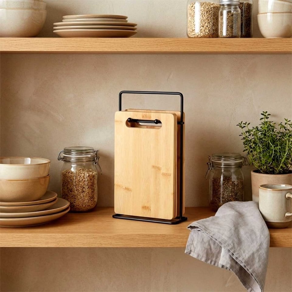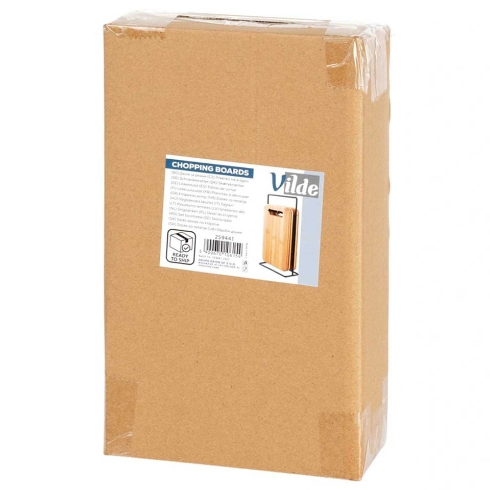 Zestaw desek do krojenia to funkcjonalne i estetyczne rozwiązanie do każdej kuchni. Stojak pomoże nam uniknąć bałaganu i zapewni porządek w kuchni. Taka forma przechowywania desek pozwoli na odpowiednią organizację przestrzeni w kuchni, a deski będą zawsze na swoim miejscu. Klasyczny wzór i kolorystyka sprawią, że zestaw pasuje do każdej kuchni. Oryginalny produkt marki Vilde. Wyprodukowano zgodnie z europejskimi standardami.