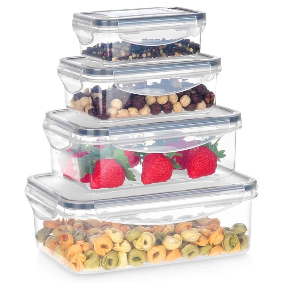 - Zestaw 4 pojemników na żywność - Zestaw 4 szt. pojemników kuchennych z pokrywkami do przechowywania żywności i produktów sypkich. W zestawie prostokątne pojemniki w czterech różnych rozmiarach (1,5 l, 1 l, 500 ml i 240 ml). Pojemniki można wygodnie przechowywać umieszczając je w największym pojemniku.