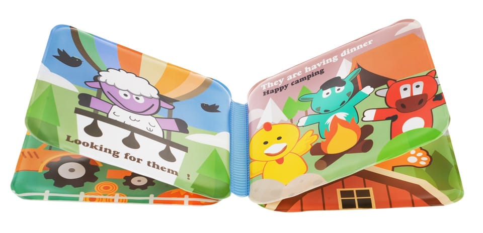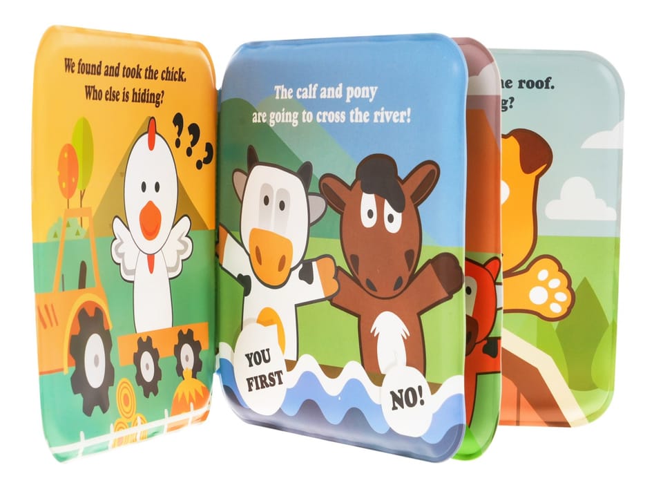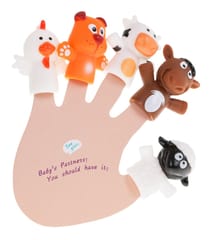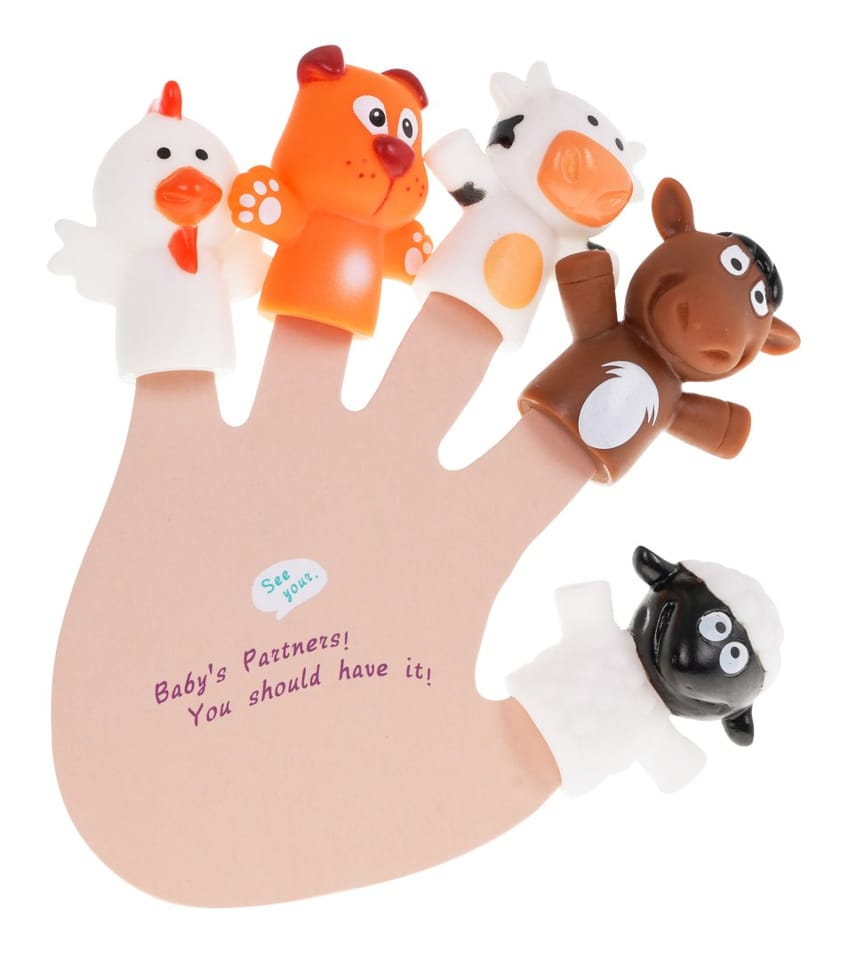 | - 5 gumowych pacynek: kurka, piesek, osiołek, krówka, baranek, - miękka książeczka. |