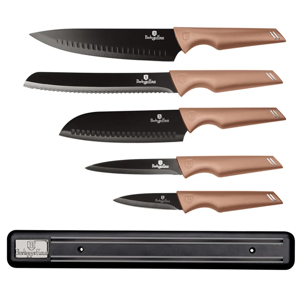 Zestaw 5 noży z listwą magnetyczną firmy BERLINGER HAUS z serii Rose Gold Metallic Collection.