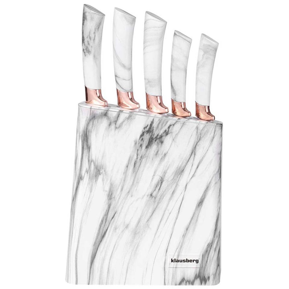 Zestaw 5 noży kuchennych w bloku. Imitacja białego marmuru.