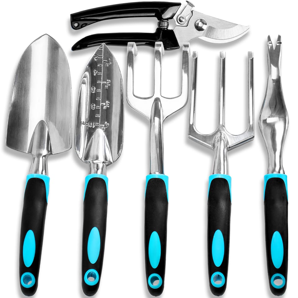 Zestaw 6 narzędzi ogodniczych ALBEN Pazurki ogrodnicze | Łopatka ogrodowa | Chwastownik | Pazurki ogrodowe | Kielnia ogrodnicza | Sekator⭐antypoślizgowe uchwyty⭐otwory do zawieszania⭐ułatwiają prace ogrodowe Zestaw narzędzi wykonano z grubego stopu aluminium, co gwarantuje odporność na rdzę!W skład zestawu wchodzą:1. Łopatka ręczna - idealna do kopania, sadzenia, przesadzania i spulchniania gleby.2. Kielnia ręczna - wyposażona w miary metryczne i calowe, ułatwia precyzyjne sadzenie.3. Ręczny kultywator (pazurki) - doskonały do rozdrabniania gleby, usuwania odpadów i mieszania gleby z nawozem.4. Widelec ręczny - świetnie sprawdza się w czyszczeniu i spulchnianiu gleby.5. Chwastownik ręczny - pozwala na szybkie i łatwe usuwanie chwastów.6. Sekator - niezbędny do precyzyjnego przycinania roślin. Informacje dodatkowePrzedstawione kolory należy traktować poglądowo - mogą odbiegać od rzeczywistych ze względu na różne ustawienia monitorów oraz proces obróbki zdjęć. Rzeczywiste wymiary mogą się różnić od podanych wyżej. Tolerancja błędów może wynosić +/- 5%. Marka:OgrodoviaKod produktu:MG330906Kod EAN:5902340330906Kolor:czarny/niebieskiMateriał:aluminium /gumowane uchwytyIlość narzędzi w zestawie:Pazurki ogrodnicze | Łopatka ogrodowa | Chwastownik | Pazurki ogrodowe | Kielnia ogrodnicza | Sekator