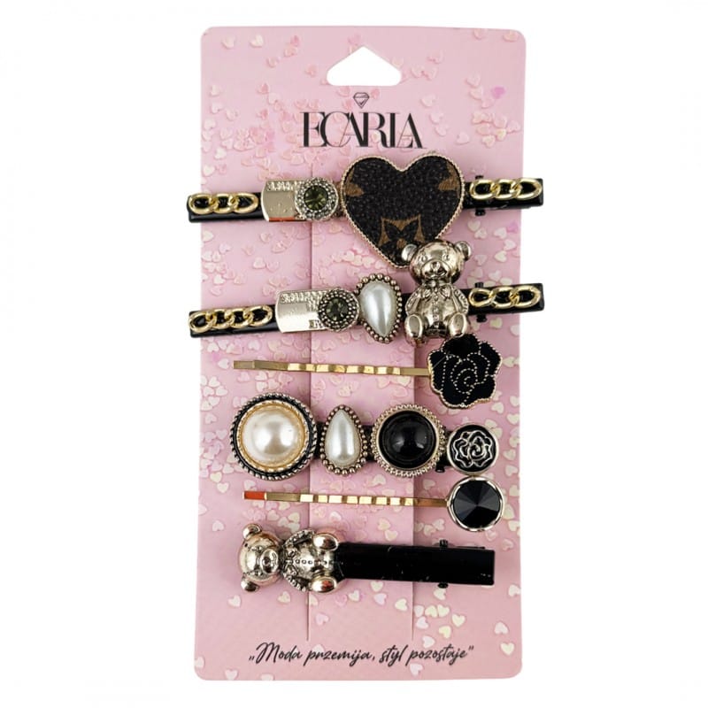 Zestaw spinek do włosów - 6 sztukmetal nieszlachetny - bez niklu i chromuUnikać kontaktu z wodą Wymiary:Długość: od 5,3 do 8 cmSzerokość; od 1,2 do 2,5 cm Waga: 29 g