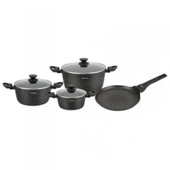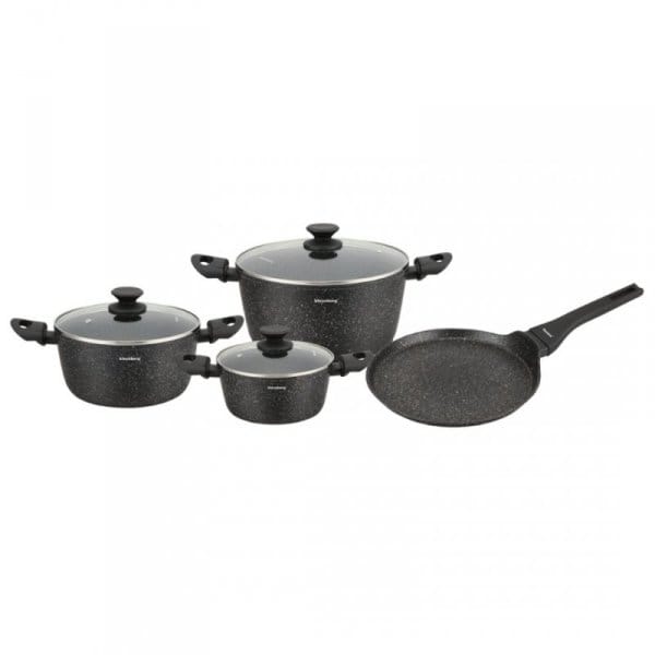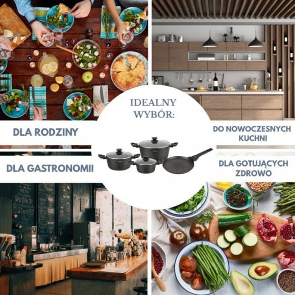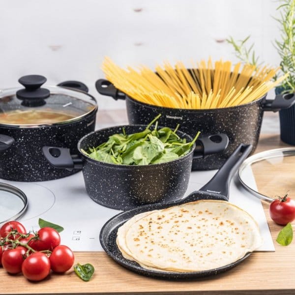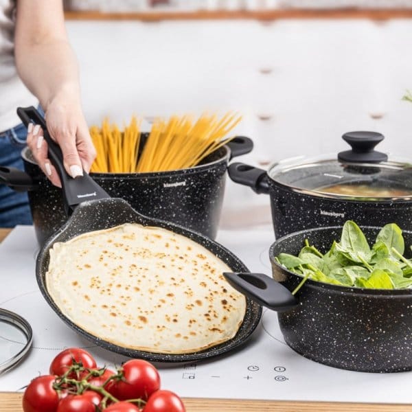 Korpus wykonany z odlewanego aluminium gwarantuje szybkie i równomierne nagrzewanie, a powłoka marmurkowa non-stick zapobiega przywieraniu potraw i umożliwia smażenie z minimalną ilością tłuszczu. Zestaw jest w pełni kompatybilny z kuchenkami indukcyjnymi, gazowymi, ceramicznymi i elektrycznymi, a jego czarny kolor z efektem “granite speckles” dodaje elegancji i nowoczesnego charakteru każdej kuchni.