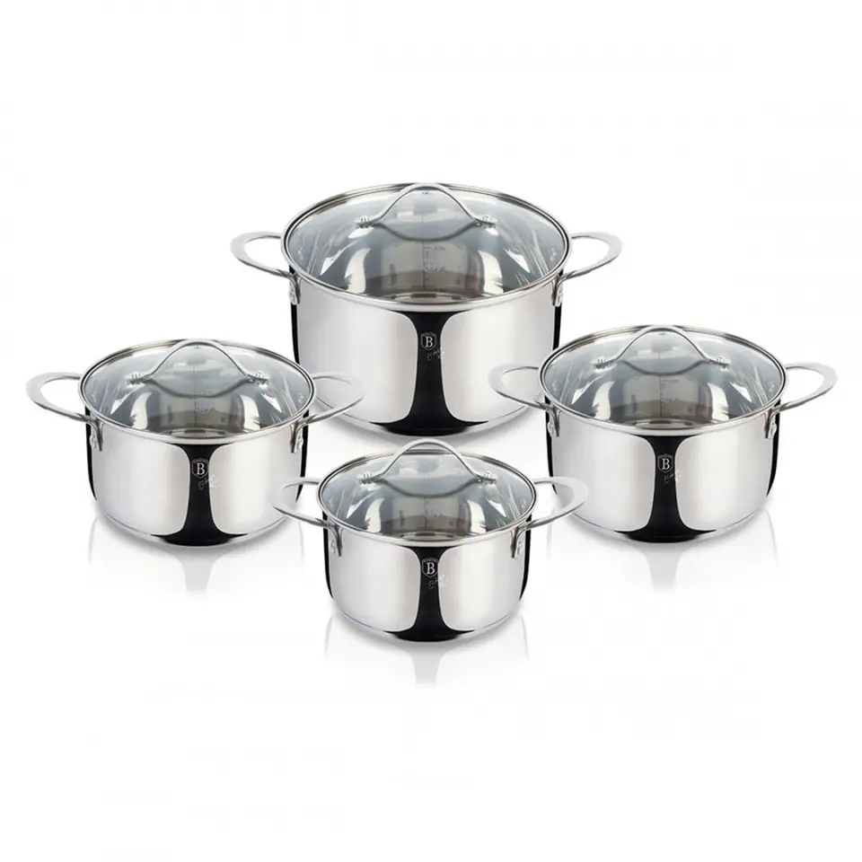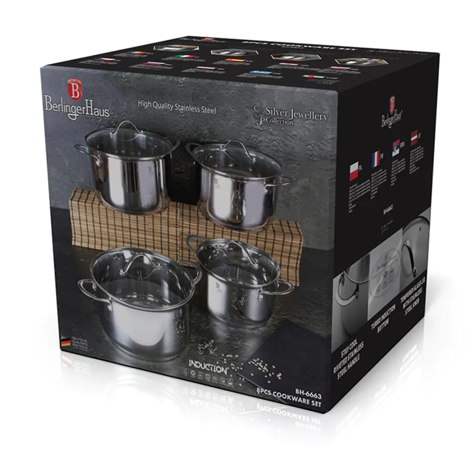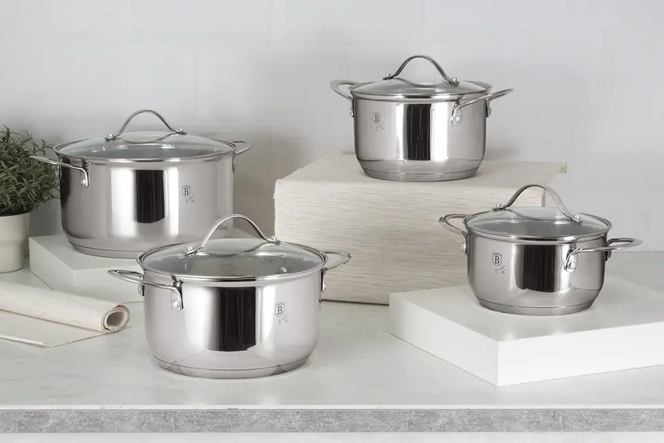 Zestaw garnków z linii Silver Jewellery firmy Berlinger Haus z wielowarstwowym dnem akutermicznym wykonany z najwyższej jakości stali chromowo-niklowej. Stal chromowo-niklowa z której wykonano zestaw jest nierdzewna, wytrzymała i długowieczna. Zastosowany materiał świetnie się prezentuje i jest wyjątkowo łatwy w czyszczeniu oraz posiada właściwości bakteriobójcze. Wielowarstwowe dno akutermiczne (5mm) gwarantują doskonały rozdział i magazynowanie ciepła. Z uwagi na swoje wyjątkowe cechy garnki te nadają się również do gotowania z minimalną ilością wody i tłuszczu. Garnki można używać na wszystkich rodzajach kuchenek, także indukcyjnych. Nitowane uchwyty gwarantują długotrwałe i bezpieczne użytkowanie. Skala pomiarowa wewnątrz każdego garnka ułatwia dozowanie wymaganej ilości wody lub innych składników przygotowywanego dania.