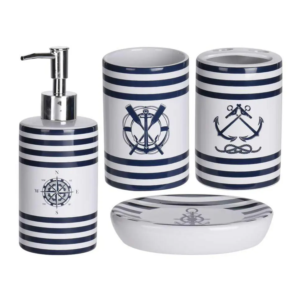 Zestaw łazienkowy w skład, którego wchodzą podstawowe akcesoria łazienkowe takie jak dozownik na mydło w płynie lub płyn do dezynfekcji, mydelniczka, kubek na wodę oraz kubek na szczoteczki. Zestaw łazienkowy wykonany jest z wysokiej jakości ceramiki z motywem marynistycznym. Zestaw ten pozwoli na przechowywanie najpotrzebniejszych rzeczy w zasięgu ręki dodatkowo będąc eleganckim uzupełnieniem każdej łazienki.Wymiary dozownika na mydło w płynie: 18x7,2 cm Wymiary kubka na szczoteczki: 10,5x7 cmWymiary mydelniczki: 12,5x8,5x3 cmWymiary kubka: 10,5x7 cm