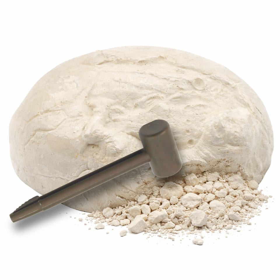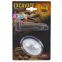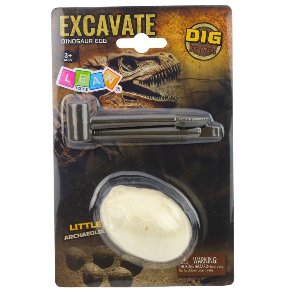 Zabawa polega na stopniowym wydobywaniu dinozaura z gipsowego jajka przy użyciu dołączonych narzędzi. Jajko należy najpierw umieścić w kubku z wodą i poczekać aż opadnie na dno. Następnie po około 5 minutach, gdy masa zmięknie, warto zabezpieczyć miejsce pracy gazetą lub ręcznikiem papierowym i rozpocząć ostrożne usuwanie warstwy gipsu przy pomocy płaskiej krawędzi dłutka. Proces należy kontynuować do momentu całkowitego odsłonięcia figurki, a po zakończeniu wykopalisk opłukać dinozaura w czystej wodzie.