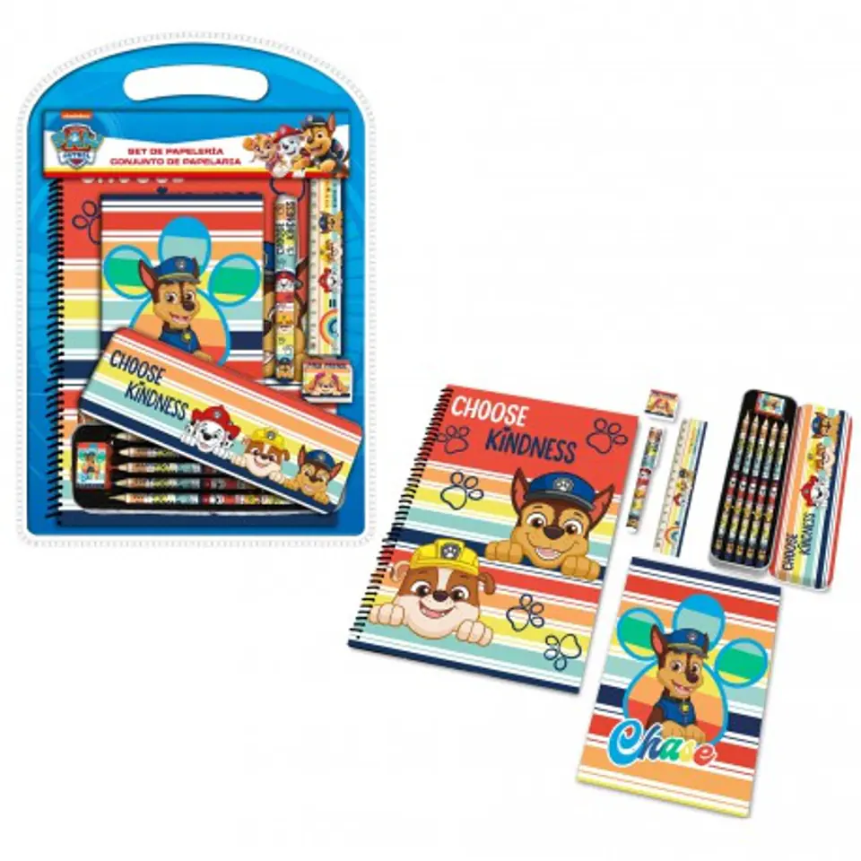 Zestaw Artykułów Szkolnych, Psi Patrol Pisz, twórz, rysuj, pokoloruj i swój pokój udekoruj. Zestaw artykułów szkolnych z motywem z bajki "Psi Patrol", to idealny pomysł na prezent dla każdego małego fana piesków. Doskonale sprawdzi się zarówno w domu jak i w szkole. Zestaw zawiera: 1 kołonotatnik A4, 1 notes A5, 1 metalowy piórnik z 5 kredkami i temperówką, 1 linijkę, 1 gumkę, 1 ołówek. Wymiary opakowania: 38 cm x 27 cm x 5 cm. Wiek: 3+. PW19723