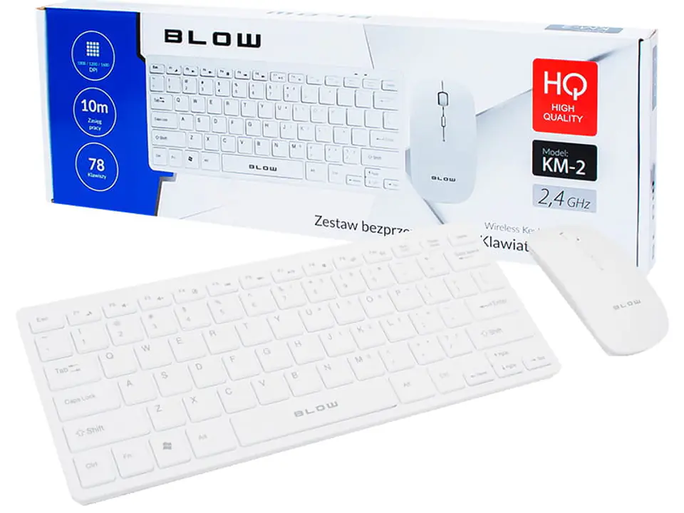 Bezprzewodowy zestaw klawiatura i mysz Blow KM-2. Zestaw wyróżnia się niewielkimi rozmiarami i niskim profilem, dzięki czemu nie zajmuje dużo miejsca na biurku. Urządzenia pracują na falach radiowych 2.4Ghz.