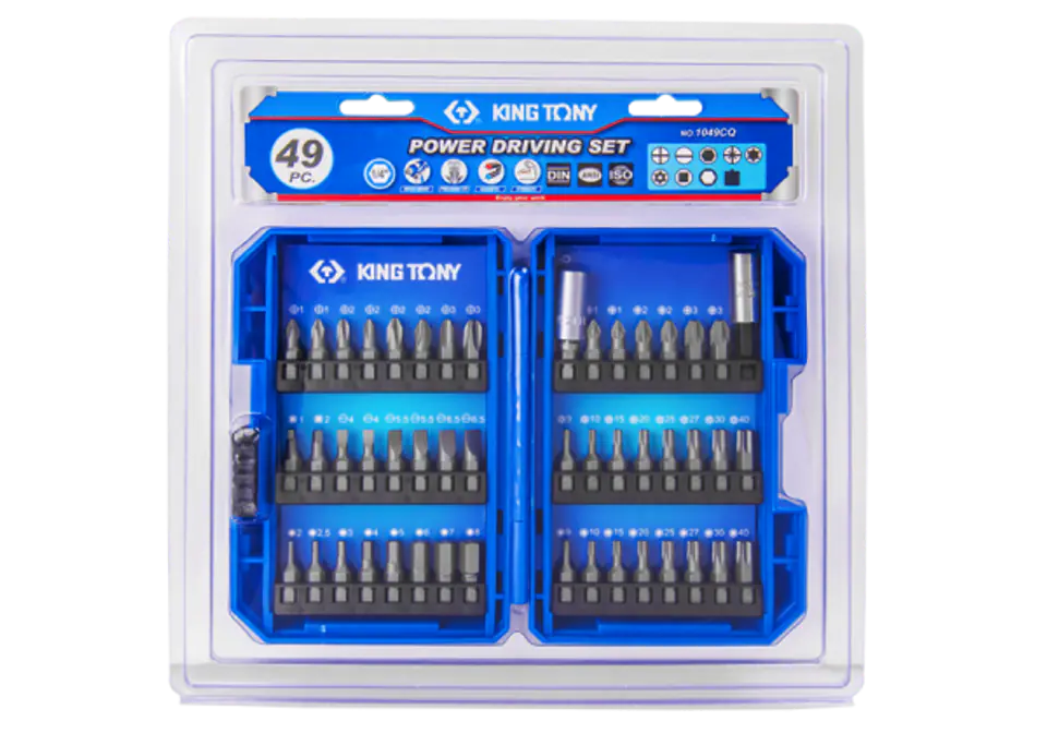 Bity wykonane są ze stali S2, końcówki nasadkowe ze stali chromowo-wanadowej. Całość w poręcznym plastikowy organizerze o wymiarach 150 x 103 x 46 mm. Karta produktu - 1049CQ