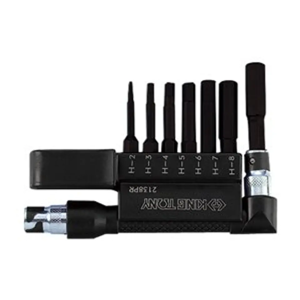 W zestawie bity w rozmiarach PH1, PH2, H4, H5, PZ2 ,S1x3,S1x5 oraz adapter kątowy. Bity o długości 50 mm wykonane są ze stali S2.