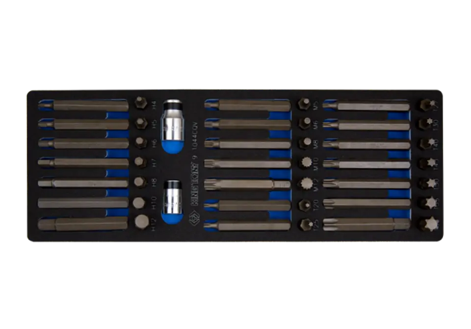Zestaw bitów 10 mm King Tony 44 elementów w piance EVA 140 x 375 mm. W skład zestawu wchodzą:- bity 10 mm krótkie (długość 36 mm ) HEX (imbus) H4, H5, H6, H7, H8, H10, H12,- bity 10 mm krótkie (długość 36 mm ) SPLINE M5, M6, M8, M10, M12,- bity 10 mm krótkie (długość 36 mm ) TORX T20, T25, T27, T30, T40, T45, T50, T55, T60,- bity 10 mm długie (długość 80 mm ) HEX (imbus) H4, H5, H6, H7, H8, H10, H12,- bity 10 mm długie (długość 80 mm ) SPLINE M5, M6, M8, M10, M12,- bity 10 mm długie (długość 80 mm ) TORX T20, T25, T27, T30, T40, T45, T50, T55, T60,- adapter do bitów 10 mm na napęd (kwadrat) 3/8" oraz 1/2".Bity wysokiej jakości i wytrzymałości. Wykonane z wysokiej jakości stopu stali krzemowo - chromowo - wanadowej (S2) , naoliwione antykorozyjnie, piaskowane. Karta produktu - 9-1044CQV