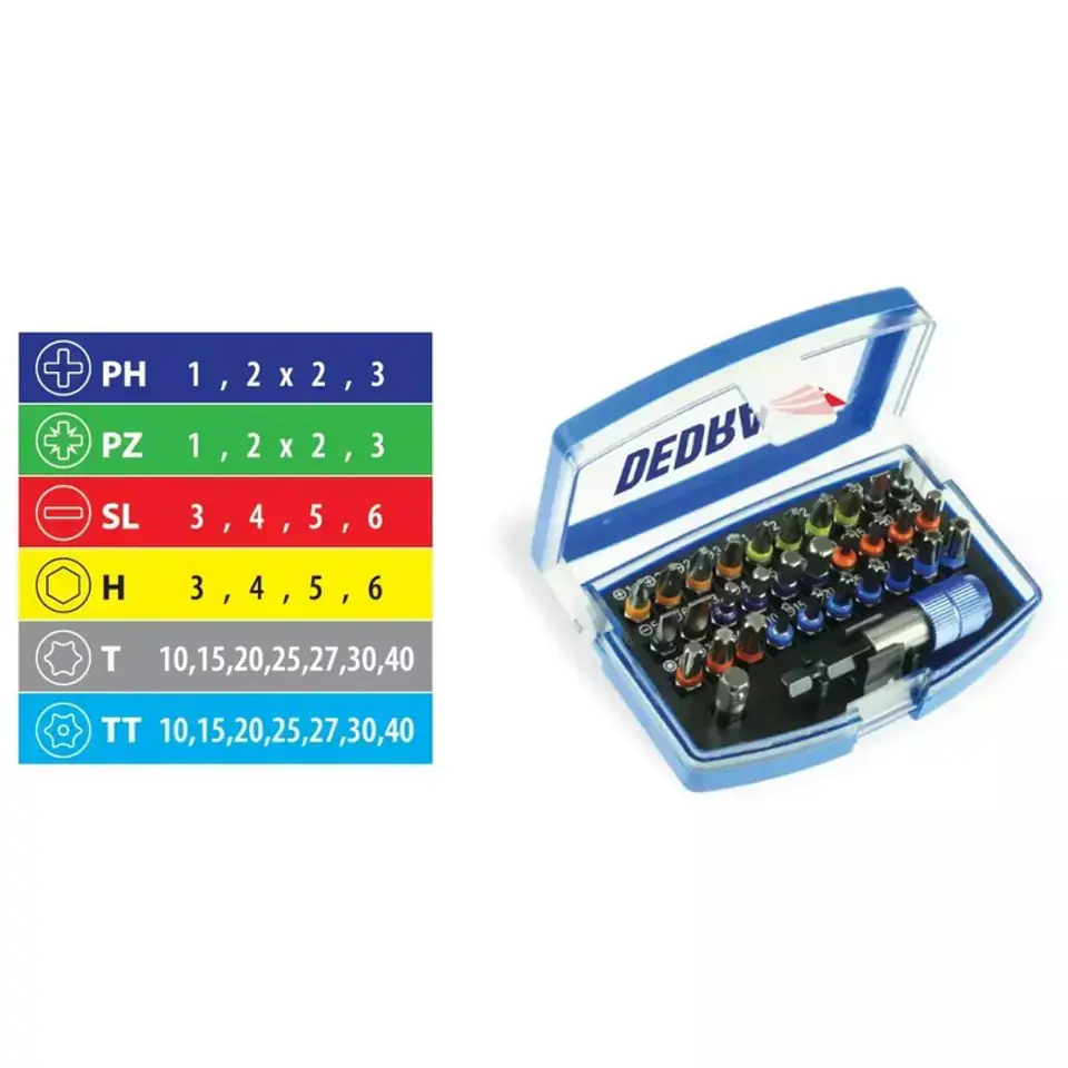 Zestaw 32 szt końcówek wkrętakowych. W skład zestawu wchodzą Końcówki PH, PZ, SL, H, T oraz TT. Końcówki wykonane zostały ze stali S2, która cechuje się wysoką hartownością oraz odpornością na uderzenia. Dzięki odpowiedniemu składowi chemicznemu i obróbce cieplnej, końcówki na długo zachowują swoje wysokie właściwości wytrzymałościowe.