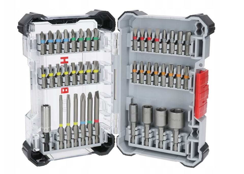 Zawiera dwa magnetyczne uchwyty na końcówki, z których jeden jest wyposażony w szybkozłączkę, nasadki oraz wiele rodzajów końcówek w różnych rozmiarach: