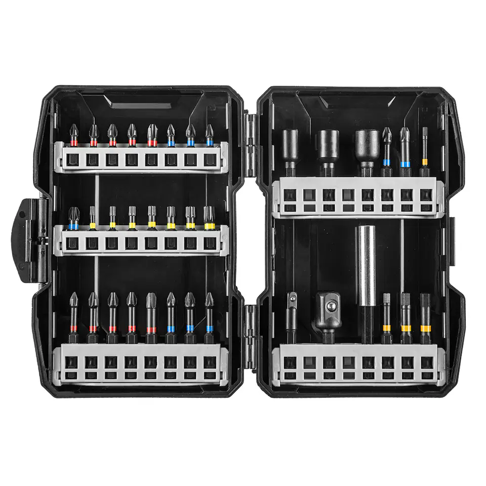 Zestaw bitów udarowych, 16 x PH1/2/2/2/3, PZ1/2/2/3, TX10/15/20/25/27/30/40, długość całkowita 25 mm, 14 x PH1/2/2/2/3, PZ1/2/2/2/3, HEX3/4/5/6 długość całkowita 50 mm, 3 x nasadka 6, 8, 10 mm, długość 48 mm, 1 x uchwyt 90 mm, 2 x adapter1/4", 1/2", długość 50 mm stal S2, napęd 1/4", 36 szt.