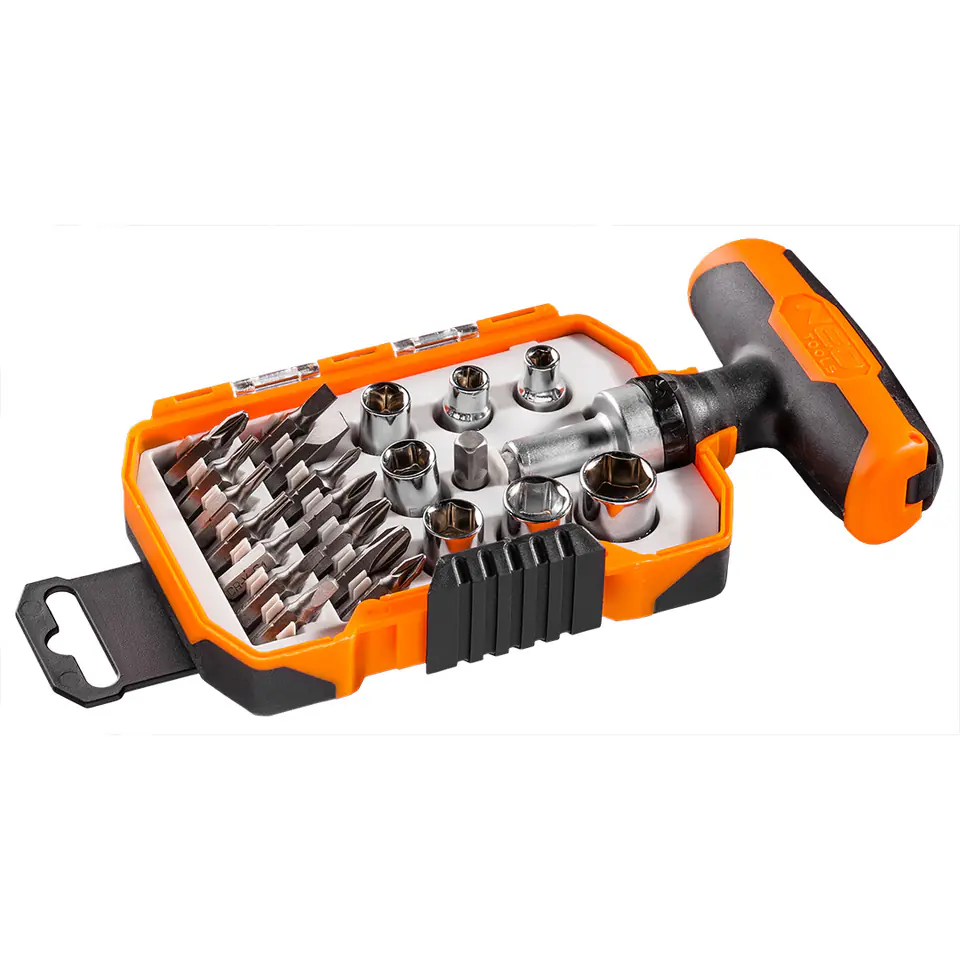 Zestaw bitów z uchwytem 22 szt., uchwyt T, stal CrV, 7 szt. nasadek, rozmiary 5, 6, 7, 8, 9, 10, 13 mm, 14 szt bitów, rozmiary SL 3/16, 1/4, PZ1, PZ2, PH0, PH1, PH2, PH3, T10, T15, T20, S1, S2, S3