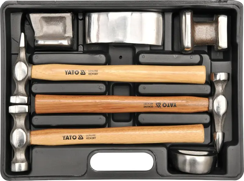 | Zawartość zestawu: | Trzy młotki o różnych profilach obuchów, Cztery kształtki stalowe służące do profilowania blachy |