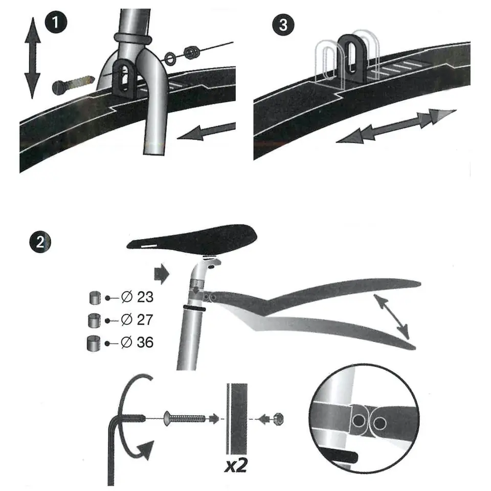 - możliwość regulacji kąta nachylenia daje optymalną ochronępołożone blisko koła są zarówno dyskretne, jak i skutecznełatwe w montażu dzięki śrubom i wspornikowi w zestawieidealny dla kół o rozmiarach 24” - 26”średnica sztycy do montażu na tylnym błotniku: 23, 27 i 36mm (redukcje w zestawie)w zestawie komplet błotników na przednie i tylne koło