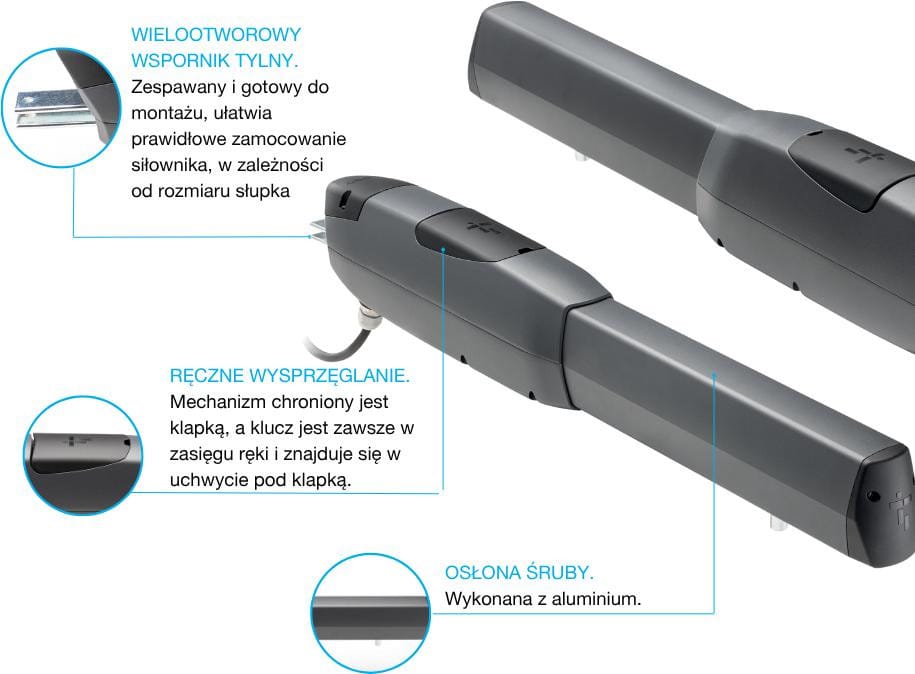 NEW ATI to owoc doświadczenia firmy CAME w projektowaniu silników stworzonych z myślą o długotrwałym użytkowaniu. Mechanizm opiera się na motoreduktorze planetarnym, chronionym przez półobudowy z odlewanego ciśnieniowo aluminium, które zapewniają optymalną wytrzymałość oraz stopień ochrony IP 54. Zaprojektowany z myślą o pracy w najbardziej wymagających warunkach klimatycznych, zapewnia niezawodne działanie w zakresie temperatur od -20° do +55°C.