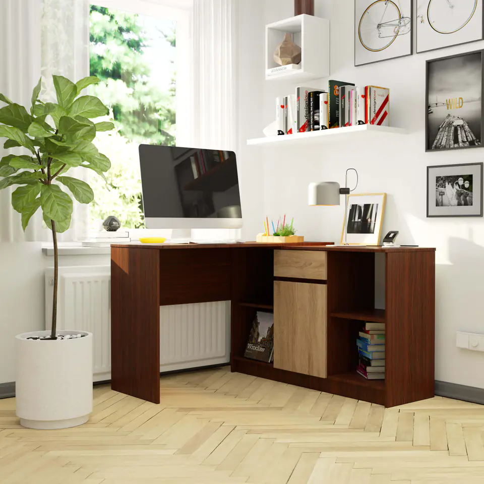 Biurko narożne B-17 wykonano z odpornej na ścieranie, laminowanej płyty meblowej w dwóch matowych kolorach. Mebel stanowi zestaw składający się z ustawionych w kształcie litery ‘L”: komody oraz prostego biurka. Komoda wyposażona została w 6 półek, z których 4 stanowią otwarte regały umieszczone po dwóch stronach centralnie usytuowanej szafki zamykanej pojedynczym skrzydłem uchylnych drzwiczek. Nad drzwiczkami znajduje się szuflada wysuwana za pomocą metalowych prowadnic rolkowych. Zarówno korpus komody, jak i biurko mają kolor drewna wenge. Z kolei front szuflady i drzwiczki utrzymane zostały w jaśniejszej barwie dębu sonoma.