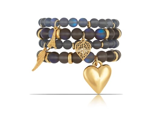 Uroczy, pozłacany zestaw czterech unikalnych bransoletek, które zachwycają swoim pięknem i elegancją. Każda bransoletka została starannie wykonana z wysokiej jakości materiałów, a ich głównym elementem są opale, kamienie o wyjątkowej grze barw, które dodają im niepowtarzalnego blasku. Na każdej z bransoletek znajduje się zawieszka w formie serca, listka, Wieży Eiffla i skrzydełka, co nadaje im wyjątkowego uroku i charakteru. Zestaw ten jest doskonałym dodatkiem do każdej stylizacji, dodając jej subtelności i klasy. Możesz nosić bransoletki razem jako zestaw lub pojedynczo, dopasowując je do swojego nastroju i okazji. Bez względu na to, jak je założysz, z pewnością będą one przyciągać uwagę i zachwycać swoim wyjątkowym wyglądem. Biżuteria z opalami to wyraz indywidualności i gustu. Dzięki jej uniwersalnemu designowi bransoletki będą doskonałym prezentem dla każdej kobiety, która ceni sobie piękno i elegancję w każdym detalu. Bransoletki są uniwersalne.
