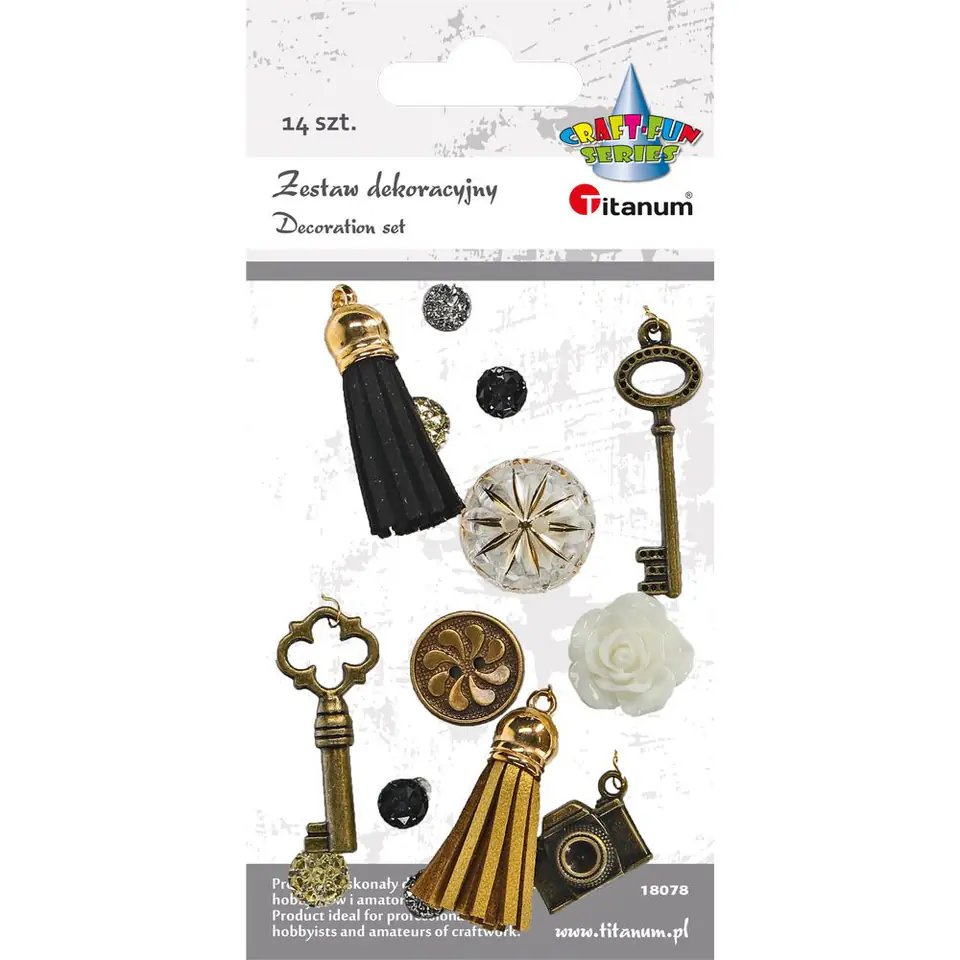Zestaw dekoracyjny: 2x frędzelki z rzemyków czarny i złoty 10x40mm, 2x klucze 8x42/11x38mm, 1x zawieszka aparat 20x15mm; naklejki 1x guzik ?17mm, 1x guzik kryształowy 22mm, 1x róża biała 20mm, 7x kryształki srebrne, złote, czarne. 14 sztuk.