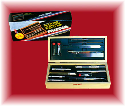 Zestaw Deluxe Railroad Modelers Set składający się narzędzi i przyrządów, pomocnych przy wszelkiego rodzaju pracach związanych z modelarstwem kolejowym. Całość opakowana w ładnym drewnianym pudełku.