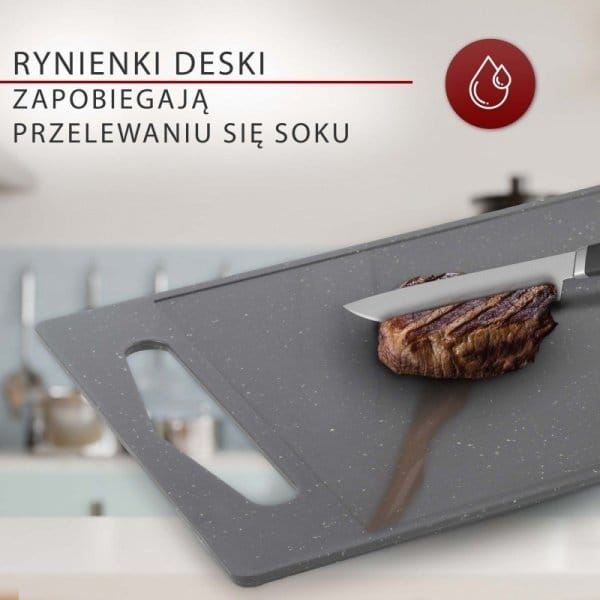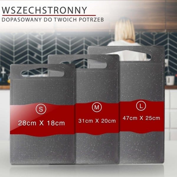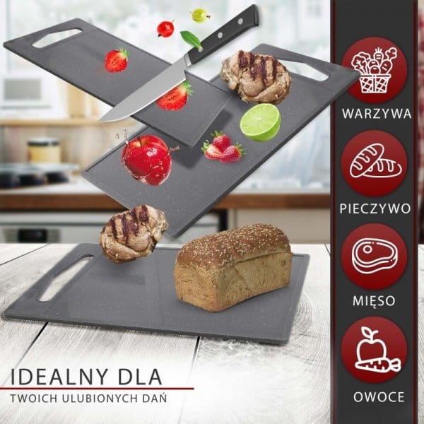3-elementowy zestaw desek do krojenia Classbach C-SB 4012 K SKU: 424012Classbach C-SB 4012 K to zestaw składający się z 3 wysokiej jakości desek o zróżnicowanych wymiarach. Są stworzone do krojenia żywności i zdecydowanie niezbędne podczas przygotowania praktycznie każdego dania. Zestaw został wykonany w całości z wysokiej jakości tworzywa sztucznego przypominającego granit. Tworzywo jest bezpieczne dla zdrowia i pozbawione szkodliwych substancji (BPA FREE). Powierzchnia desek wykonana jest z tworzywa które nie zużywa nadmiernie ostrzy noży.Krawędzie desek posiadają rynienki które zapobiegają przelewaniu się soku z krojonych składników poza obszar roboczy.Deski są niezwykle łatwe w utrzymaniu czystości dzięki przystosowaniu do mycia pomocy zmywarki do naczyń.Najważniejsze cechy zestawu Classbach C-SB 4012 K:Materiał pozbawiony szkodliwego BPAZestaw 3 desek do krojenia w trzech rozmiarach:S : 286 x 4 x 185 mmM : 315 x 4.2 x 206 mmL : 375 x 5 x 250 mmKolor: szary granitUchwyty umożliwiające powieszenie desekPowierzchnia desek wykonana jest z tworzywa które nie zużywa nadmiernie ostrzy nożyPrzystosowane do mycia w zmywarceWymiary opakowania: 254 x 382 x 18 mmDlaczego warto kupić zestaw desek Classbach C-SB ?Bezpieczne dla zdrowiaTworzywo jest bezpieczne dla zdrowia i pozbawione szkodliwych substancji (BPA FREE)Dopasowane do potrzebZestaw składa się z 3 wysokiej jakości desek o zróżnicowanych wymiarach: S, M oraz LEstetyczneZestaw został wykonany w całości z wysokiej jakości tworzywa sztucznego przypominającego granit.Łatwe w czyszczeniuDeski są niezwykle łatwe w utrzymaniu czystości dzięki przystosowaniu do mycia pomocy zmywarki do naczyń.Wymiary opakowania (ok. szer. x wys. x gł.)Opakowanie: 254 x 382 x 18 mmDeski wolne od BPACertyfikat BPA Free daje świadectwo, iż produkty są tworzone w trosce o Twoje zdrowie i bezpieczeństwo.Deski zostały wykonane z tworzyw wolnych od BPA, dzięki temu masz pewność, że produkty w nich przechowywane będą wolne od szkodliwych dla organizmu, toksycznych cząstek Bisfenolu A.Produkt został odznaczony certyfikatem FOCUS - TEST DEUTSCHLANDS BESTECertyfikat TEST DEUTSCHLANDS BESTE został przyznany na podstawie badań przeprowadzonych przez „Germanys best household electronics”. W ramach testu porównane zostały produkty z ponad 20 000 marek z 274 segmentów rynkowych.Celem wyróżnienia „Focus” jest wskazywanie produktów cieszących się największym uznaniem konsumentów. Certyfikat przyznany jest na podstawie badań niemieckiego rynku i potwierdza wysoką jakość produktów a także świadczy o dużym zaufaniu konsumentów i renomie marki....