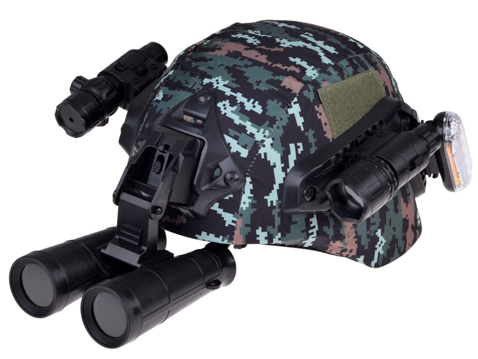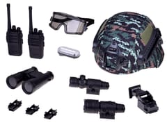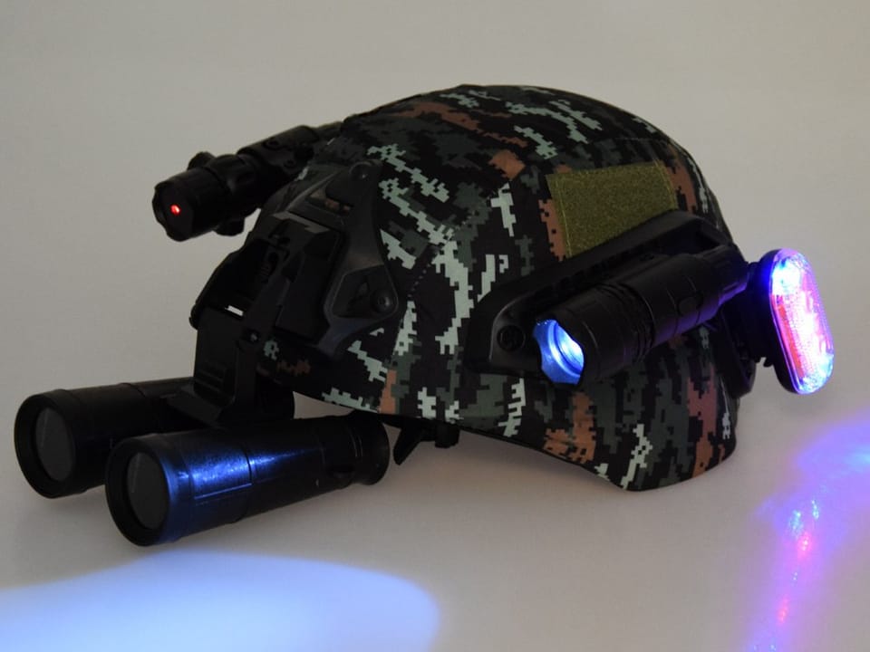Ten super hełm sprawi, że zabawa będzie jeszcze bardziej realistyczna. Hełm będzie też świetnym uzupełnieniem kostiumu na bal przebierańców. Wykonany jest z wytrzymałego tworzywa sztucznego. Wewnątrz jest wyłożony miękką gąbką, na zewnątrz obleczony materiałem w kolorze moro. Wyposażony jest w regulowany pasek podbródkowy, dzięki czemu łatwo go dostosować do głowy dziecka. Na hełmie znajdziemy również elementy, do których zamontować można dodatkowe akcesoria: lampkę, celownik z lampą i laserem a także lornetkę. Dużą lampkę można zainstalować na hełmie lub dowolnym elemencie ubrania (np. w kieszeni), wystarczy ją wsunąć. Czerwone i niebieskie diody świecą światłem stałym, przerywanym lub alarmowym- lampka posiada trzy tryby świecenia. Na hełmie można zamontować również dwa celowniki- z cienką wiązką laserową w kolorze czerwonym, a także zwykłą lampką. Efekty świetlne wyglądają niesamowicie realistycznie, zwłaszcza w zaciemnionych pomieszczeniach! Celowniki montuje się na "szynie", więc łatwo je przesuwać a także obracać. Na czole hełmu z kolei mamy możliwość zainstalowania lornetki, którą można opuszczać i podnosić. Lornetka na prawdę zbliża, a dodatkowo można regulować jej rozstaw.
