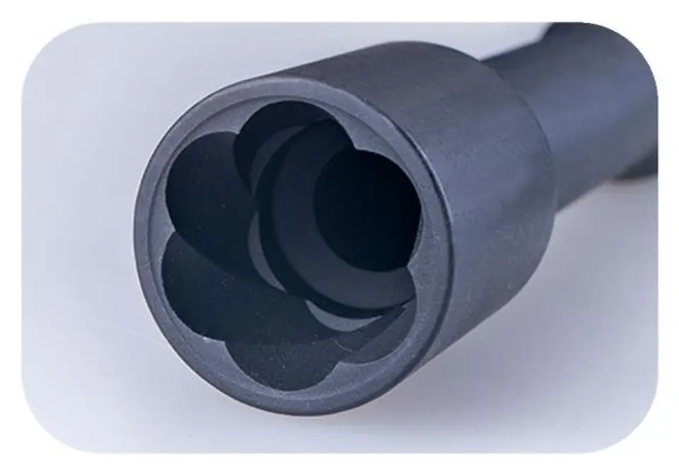 Do usuwania uszkodzonych nakrętek kół i nakrętek zabezpieczających. Szczególnie przydatny do głęboko osadzonych nakrętek kół na nowoczesnych stopach. Konstrukcja gniazda skręcania pozwala łatwo usunąć zdjętą nakrętkę z końcówką. Długość: 146 mm. W zestawie nasadki o wymiarach: 17, 19, 21, 22 mm oraz