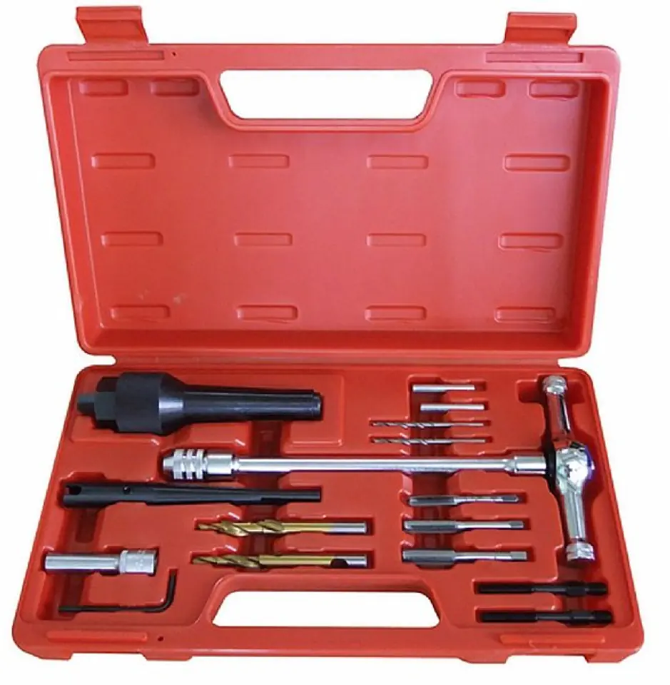 Zestaw pozwala na demontaż urwanych świec żarowych M8x 1,00 mm. Naprawę można przeprowadzić bez konieczności demontażu głowicy - w takim przypadku w miejscu odpowiedniego wtryskiwacza należy zamontować adapter pneumatyczny . Sprężone powietrze uniemożliwi przedostanie się pozostałości po obróbce do komory spalania.