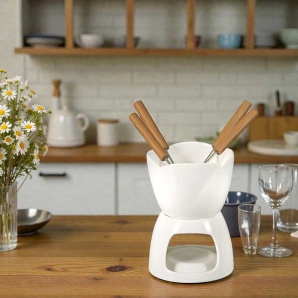 FONDUE + WIDELCZYKIZestaw do czekoladowego fondue dla 4 osób. Fondue to świetny pomysł na wspólne biesiadowanie podczas długich wieczorów.Materiał: ceramika, stal nierdzewna, Zestaw zawiera: 1x miska ceramiczna o średnicy 10,5 cm, wysokości 8 cm, 1x stojak ceramiczny do świeczki (średnica 10,5 cm, wysokość 7,5 cm), 4x widelec ze stali nierdzewnej o długości 17,5 cm z rączką bambusową. ....