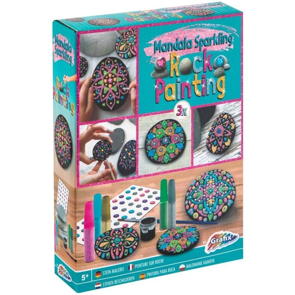 Zestaw do malowania kamieni MANDALA (3x Kamień, 61x Farbka, 5x Farbka w tubce 1x Pędzelek) 200036 MOXY Zestaw do malowania kamieni, składający się z 3 sztuk kamieni, arkusza z 30 szt kryształków do naklejenia, pędzelka i 6 kolorów farby oraz 5 szt. brokatów w żelu. Zawartość fantastycznie nadaje się do wyjątkowego udekorowania kamieni i stworzenia z nich istnych dzieł sztuki. Na kamieniach można namalować mandalę lub cokolwiek dziecko sobie wymyśli. Produkt przeznaczony dla dzieci powyżej 5 roku życia.