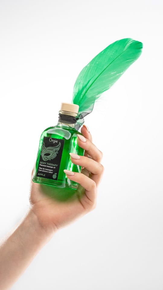 Olejek do masażu Sexy Therapy Kissable Massage Oil ma przyjemny efekt rozgrzewający i zachwycający aromatem zielonego jabłka. Zestaw ten jest idealny do drażniących pocałunków podczas gry wstępnej lub pierzastych masaży sensorycznych w strefach erogennych oraz seksu oralnego.