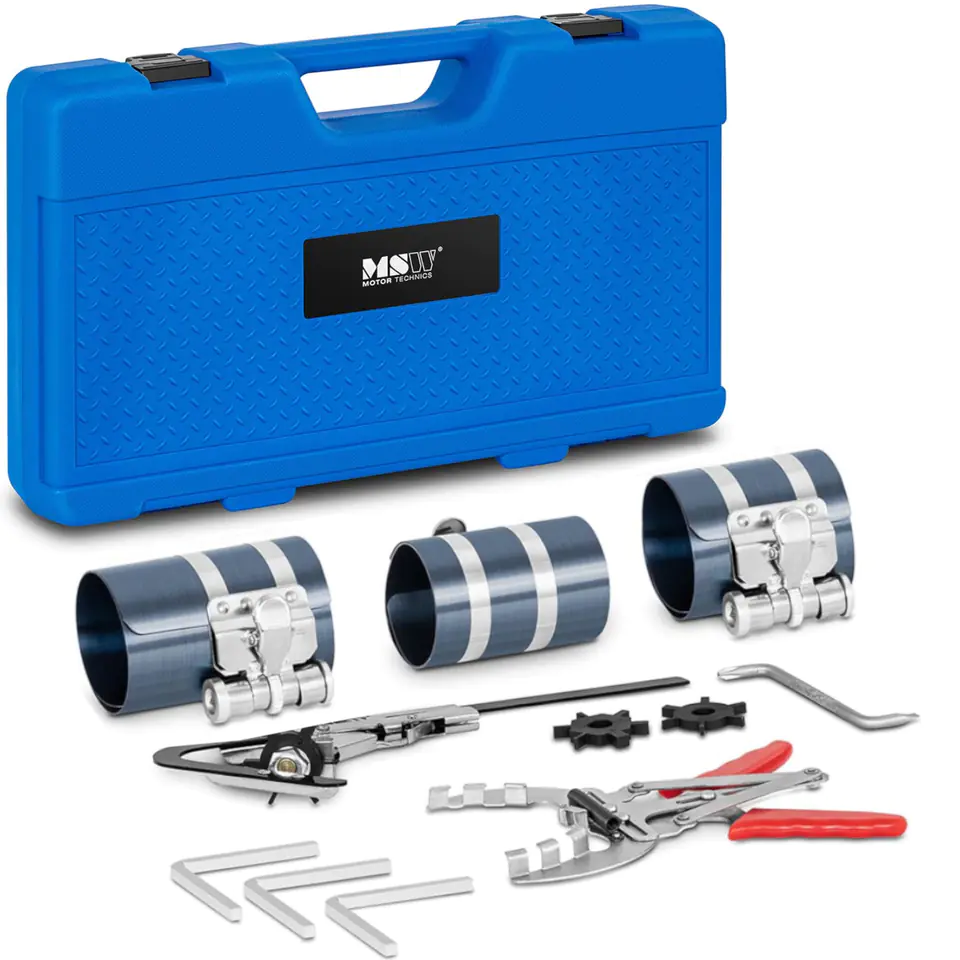 Kod producenta: 10061331Ściągacz do pierścieni tłokowych marki MSW to narzędzie do montażu i demontażu tych elementów. Pozwala usprawnić czyszczenie pierścieni. Komplet składa się z zestawu opasek zaciskowych na pierścienie tłokowe o różnych wymiarach oraz szczypiec o zakresie roboczym 50-100 mm a także specjalnego przyrządu z wymiennymi ostrzami do czyszczenia rowków tłoku. Narzędzia wykonano ze stali węglowej, która znosi duże naciski i obciążenia oraz działanie czynników zewnętrznych. Bezpieczeństwo zapewnia samozamykająca się zapadka, która zapobiega przedwczesnemu zwolnieniu i umożliwia skuteczne blokowanie. W komplecie znajduje się walizka do wygodnego przechowywania i transportu sprzętu.Cechy produktu: