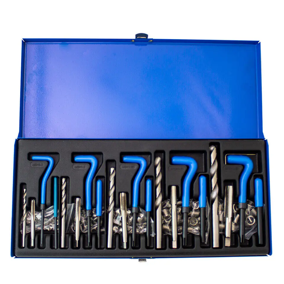5x wiertła rozwiercające, 5x gwintowniki, 5x wkrętaki do wkładek gwintowych/tulejek, 5x wybijaki, 110x wkładek gwintowych (M5x0,8 / M6x1,0 / M8x1,25 / M10x1,5 / M12x1,75), 1x praktyczne metalowe pudełko.