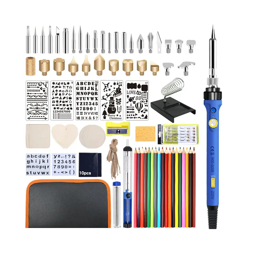 LUTOWNICA 60W WYPALARKA DREWNA PIROGRAF ETUIZestaw z największą ilością szablonów do wypalania.Kolba o mocy 60W zapewnia przyjemną pracę nawet przy wymagających projektach.Dzięki niej wypalisz szczegółowy obraz w drewnie, czy na pasku skórzanym jak i sprawnie naprawisz zepsute elementy elektroniczne.Kolba ma regulacje temperatury, dzięki niemu sterujesz intensywnością wypalana.Budowa kolby grotowej Uniwersalny grot typu 900m Wylot rozgrzanego powietrza dzięki temu zostaje wydłużona żywotność grzałki Nakrętka odporna na wysokie temperatury Wyprofilowana rączka Wskaźnik pracy Regulacja temperatury Włącznik zasilania Zabezpieczenie łączące kolbę z przewodemLutownica grotowa charakteryzuje się małym rozmiarem, niewielką wagą jest ława do przenoszenia.Lutownica ma możliwość regulacji temperatury w zakresie od 200 do 480°CLutownicę można używać przy serwisie elektronicznym np.: SMTDzięki dużej mocy elementu grzejnego możemy uzyskać trwałe wysokiej jakości spoiny lutownicze.Rączka ma ergonomiczny kształt, a materiały z którego jest wykonana trwały bezpieczny.Lutownica charakteryzuje się: Napięcie 220V~240V/AC 50Hz Maksymalna moc: 60W Moc znamionowa: 18W Zakres temperatur 200~480°C/428~896 °F Regulacja temperatury: Tak Włącznik zasilania: Tak Wskaźnik pracy: TAK Waga: 0.26kg ±10% Praca w temperaturze: 0~40 °C Długość przewodu: 136cmPo skończeniu pracy wypalarkę odkładamy bezpiecznie na przeznaczoną do tego podstawkę.Lutownica jest wykonana z wysoką starannością z dobrej jakości elementów. Dzięki temu urządzenie będzie długo bez awaryjnie działać. Kolba ma zamocowany mocny i solidny element grzejny.Jeżeli masz dużo pomysłów na zdobienie drewnianych przedmiotów, ta wypalarka pozwoli Ci na łatwą ich realizacje. Zdobić możesz: zabawki, sprzęty kuchenne, meble, skrzyneczki, pudełka,wizytówki na drzwi, zakładki do książki, biżuterię, ozdoby świąteczne, rysować, obrazki,portrety.Wszystkie elementy są chowane w solidnym etui, co pozwoli zachować porządek