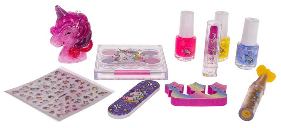 | Wymiary | - lakiery ok. 5,5 cm x 2,5 cm,- pilnik ok. 7 cm x 2 cm x 0,4 cm,- zestaw cieni ok. 7 cm x 7,5 cm x 1 cm,- pojemniczek w kształcie jednorożca z błyszczykiem ok. 6,5 cm x 4,5 cm x 2,5 cm,- szminka ok. 5,3 cm x 1,3 cm,- aplikator do brokatu ok. 9 cm x 2 cm x 1,5 cm,- opakowanie ok. 28 cm x 24 cm x 4 cm. |