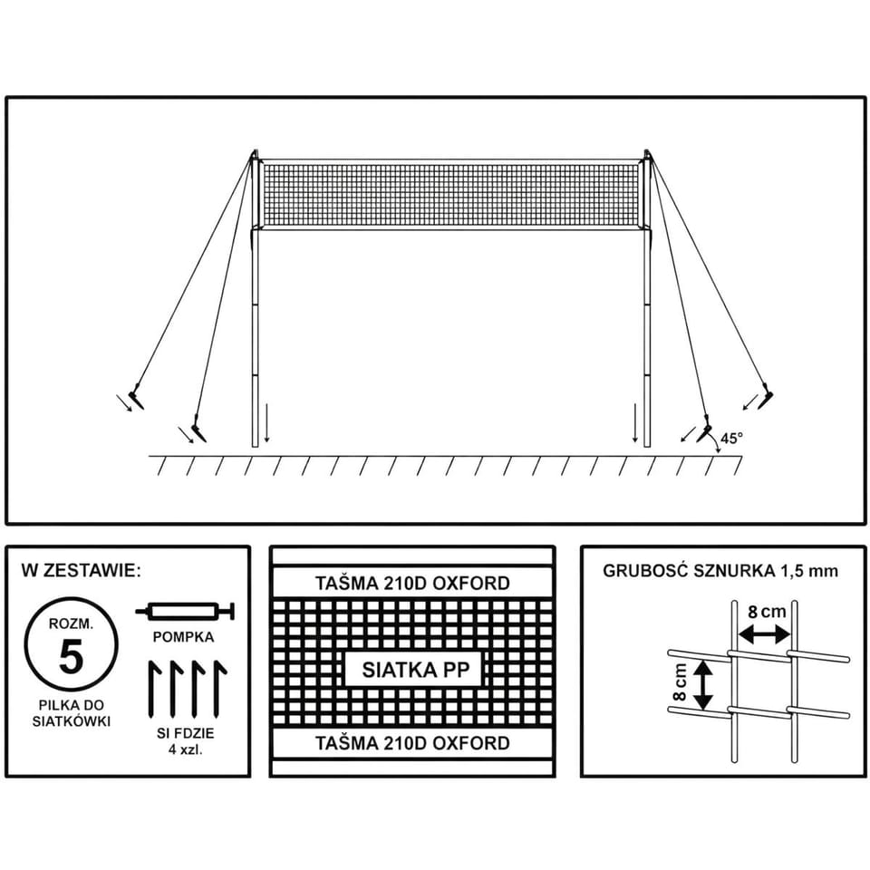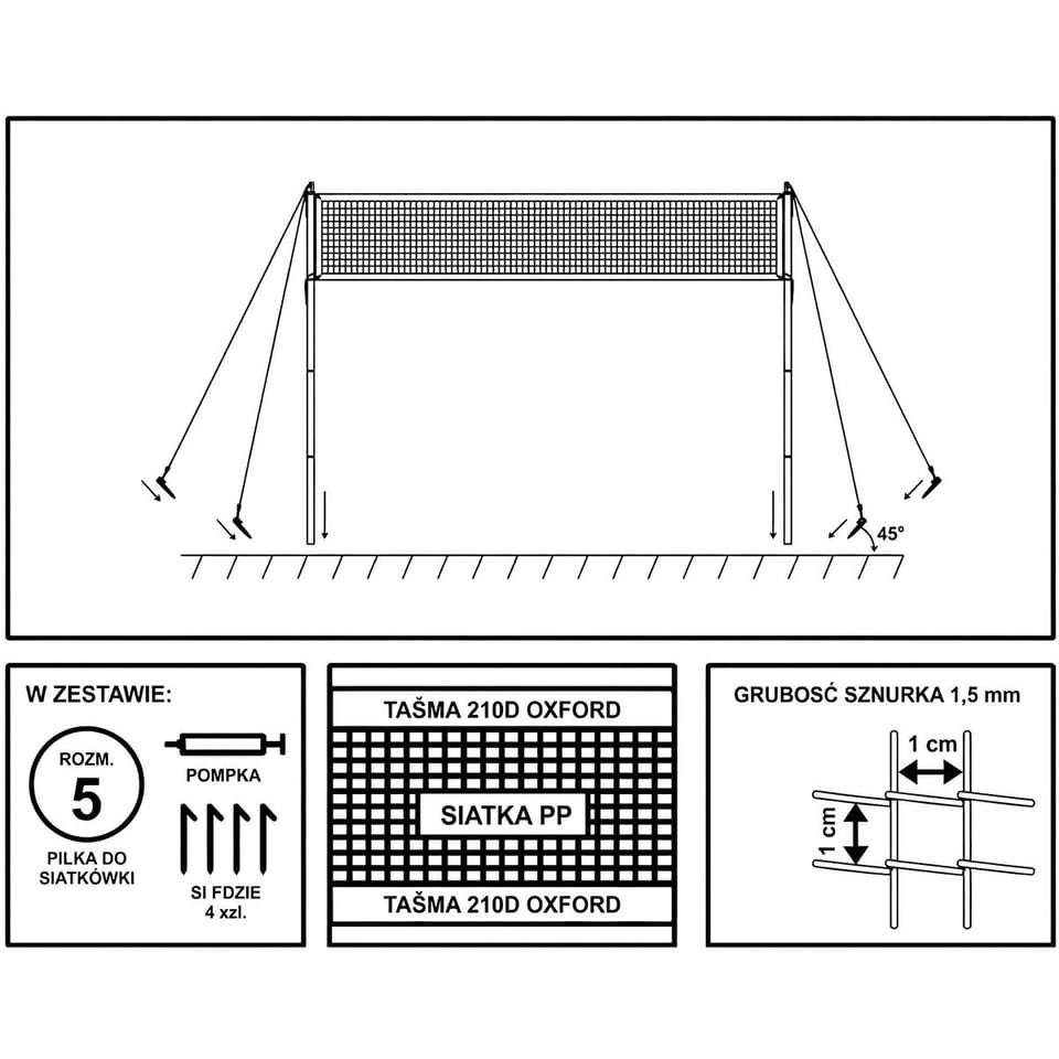 Parametry:- Wymiary ok.: 570 x 230cm (szer. x wys.)Słupki malowane proszkowo o wymiarach ok.: 19x05mmMateriał: siatka PP z taśmą z matyeriąłu Oxford 210D, słupki stal, piłka PVCWymiar siatki ok.: 570 x 55 cmGrubość linki siatki ok.: 1,5 cmWielkość oczek: 8x8cmW zestawie: siatka, słupki, piłka w rozmiarze 5, pompka, śledziePosiada certyfikat CE i jewst zgodna z normą EN 71Opakowanie (karton): 66 x 16,5 x 8 cmMarka: Enero
