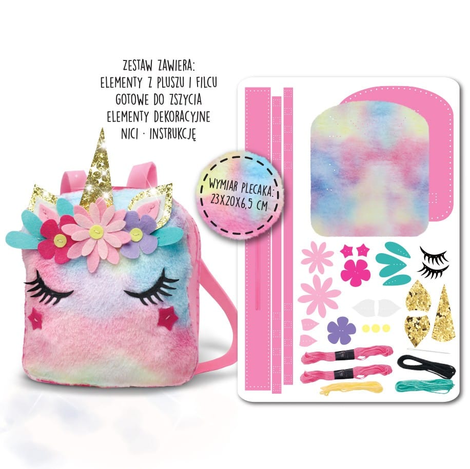 Zestaw do szycia - Plecak Jednorożec - to idealny pomysł na spędzenie wolnego czasu. Dzieki temu zestawowi, każda dziewczynka może uszyć plecak o wymiarach około 23 cm x 20 cm x 6,5 cm , który będzie idealnym dopełnieniem modnych stylizacji. Zestaw zawiera: elementy z filcu i pluszu gotowe do zszycia, elementy dekoracyjne, nici, plastikową igłę, instrukcję.