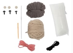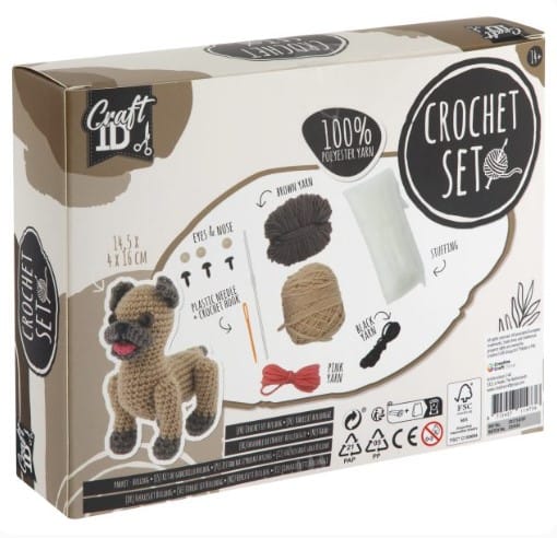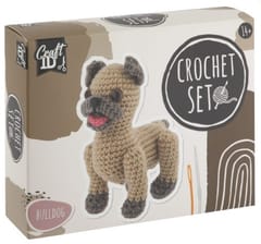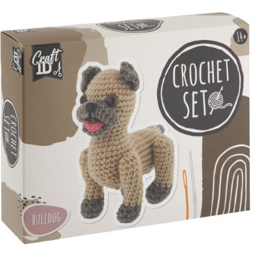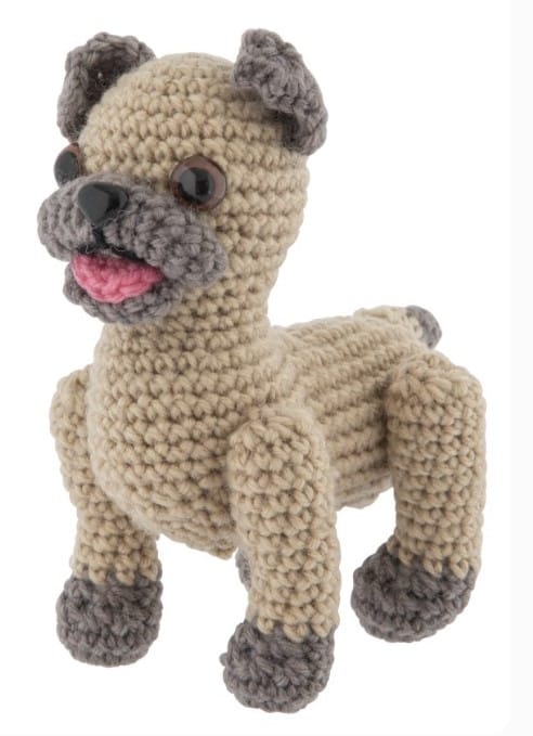 Zestaw do szydełkowania Buldog. Po wykonaniu piesek ma wymiar 9,5 cm x 15,5 cm x 16 cm.Zestaw zawiera: