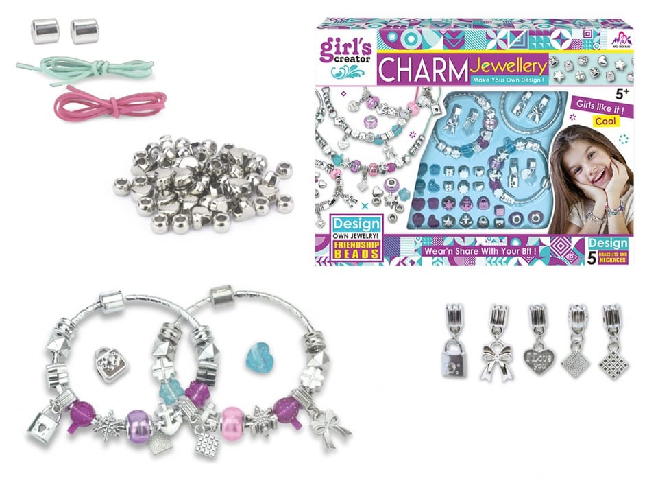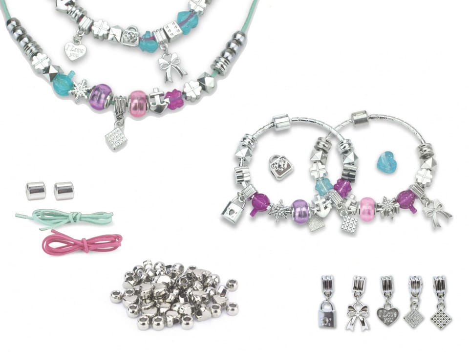 - Zestaw zawiera: 3 bransoletki, 2 naszyjniki, charmsy, koraliki