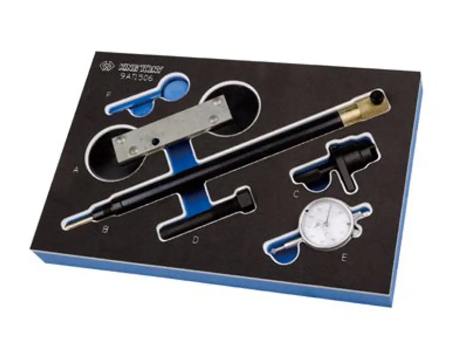 W zestawie:A – płytka do ustawiania wałka rozrządu B – wskaźnik TDC C – narzędzie do ustawiania wałka rozrządu D – narzędzie do blokowania wałka rozrządu E – manometr wskaźnika F – trzpień blokujący napinacz. Model: Audi:A1(10-12) / A3(03-12) Seat: Altea/Altea XL(08-12) / Ibiza/Cordoba(08-12) / Leon(07-12) / Toledo(07-09) Skoda: Fabia II(07-12) / Octavia II(04-12) / Roomster(06-12) / Superb II(09-12) / Yeti(09-12) VW: Caddy/ Caddy Maxi(10-12) / Eos(06-12) / Golf(03-12) / Golf Plus(03-12) / Jetta(06-12) / Passat(05-11) / Polo(02-12) / Scirocco(08-12) / Tiguan(07-12) / Touran(03-12) Karta produktu - 9at1506e