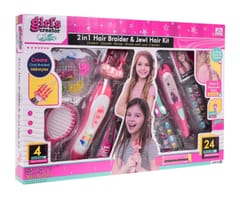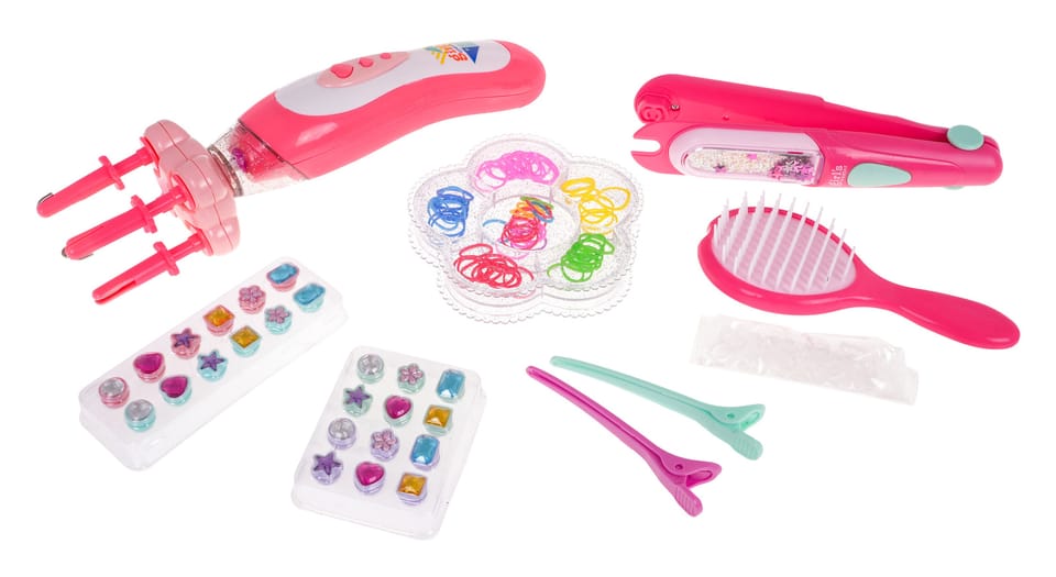 | - maszynka do zaplatania włosów,- maszynka do aplikacji biżuterii na włosach,- 2 x spinka do włosów,- 24 x biżuteria na włosy (diamenciki),- 24 x spinka do biżuterii do włosów,- szczotka do włosów,- 64 gumki do włosów w pudełeczku z przegródkami,- instrukcja. |