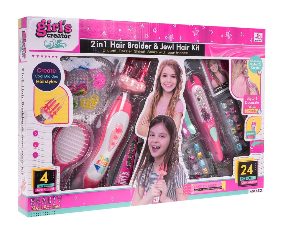| - maszynka do zaplatania włosów ok. 25 cm x 5 cm x 5,5 cm,- maszynka do aplikacji biżuterii na włosach ok. 18 cm x 3,5 cm x 3,5 cm,- spinka do włosów ok. 9,5 cm x 1,5 cm x 2 cm,- diamenciki ok. 1 cm x 1 cm,- szczotka do włosów ok. 14,5 cm x 6,5 cm x 2,5 cm,- pudełeczko na gumki do włosów ok. 11 cm x 11 cm x 2 cm,- opakowanie ok. 46 cm x 31,7 cm x 6,5 cm. | |
