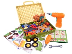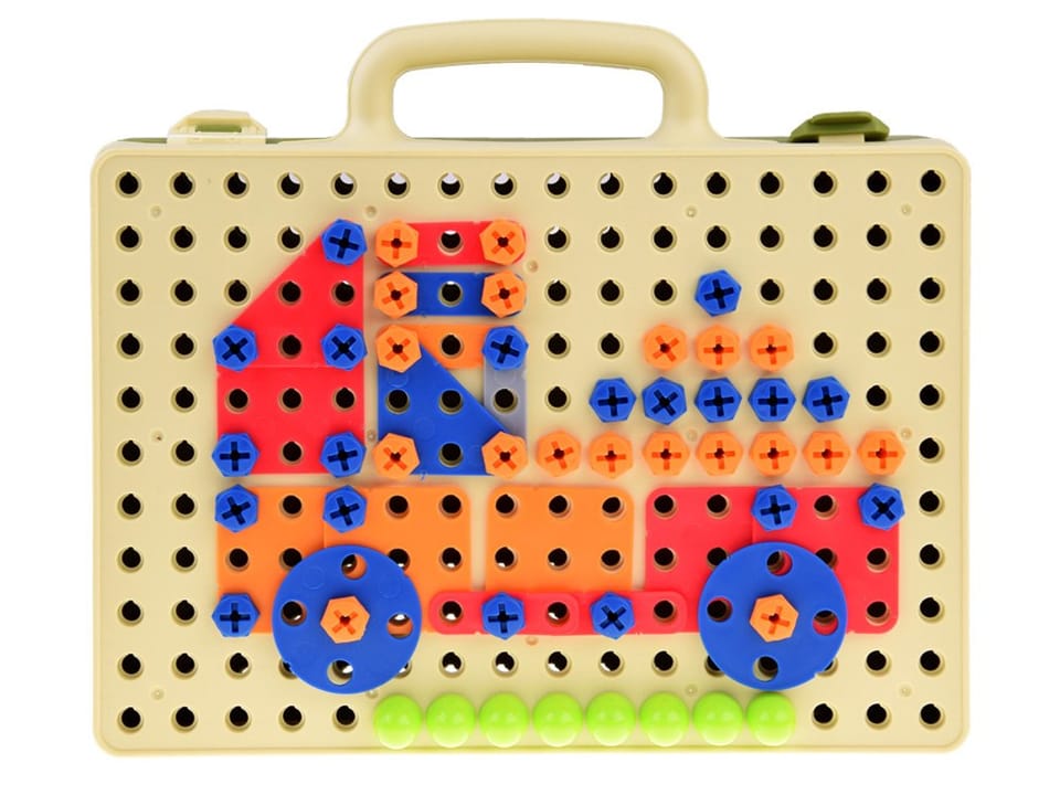 ZESTAW ZAWIERA:- wiertarka (zasilana jest 2 bateriami typu AA - 2 x 1,5V - brak w zestawie)- klucz- 2 szt. końcówek- plastikowe elementy - 40 szt. śrub- 20 szt. zakrętek- 20 szt. plastikowe pinezki- śrubokręt oczko- 6 szt,. kątownik- 4 szt. planszy z tekturowymi elementami- instrukcja