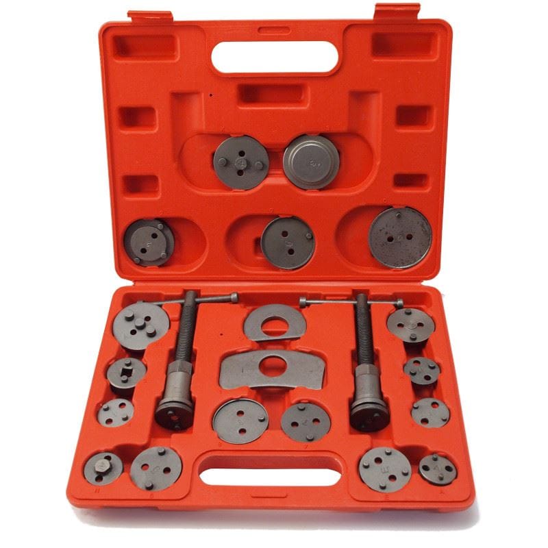 W skład zestawu wchodzi:– praska prawoskrętna– praska lewoskrętna– belka do zapierania praski o siodło zacisku hamulcowego– zestaw krążków do wyciskania tłoczków hamulcowych