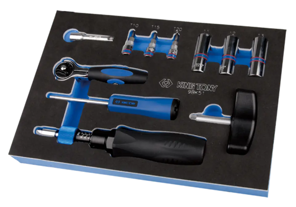 W zestawie:- 2033 - nasadki 1/4" z końcówką TORX T10, T15, T20- 2235M - nasadki krótkie 1/4" w rozmiarach: 11, 12, 13 mm - 2221-02 - przedłużka 1/4", 54 mm - 2752-45G - grzechotka 1/4"- 34101-040M - klucz do zaworów wentyli 0,45 Nm- 341214M - wkrętak dynamometryczny 1/4" 1,4Nm- 34211-3 DG - wkrętak dynamometryczny 1/4" 4-9Nm Karta produktu - 9BK51
