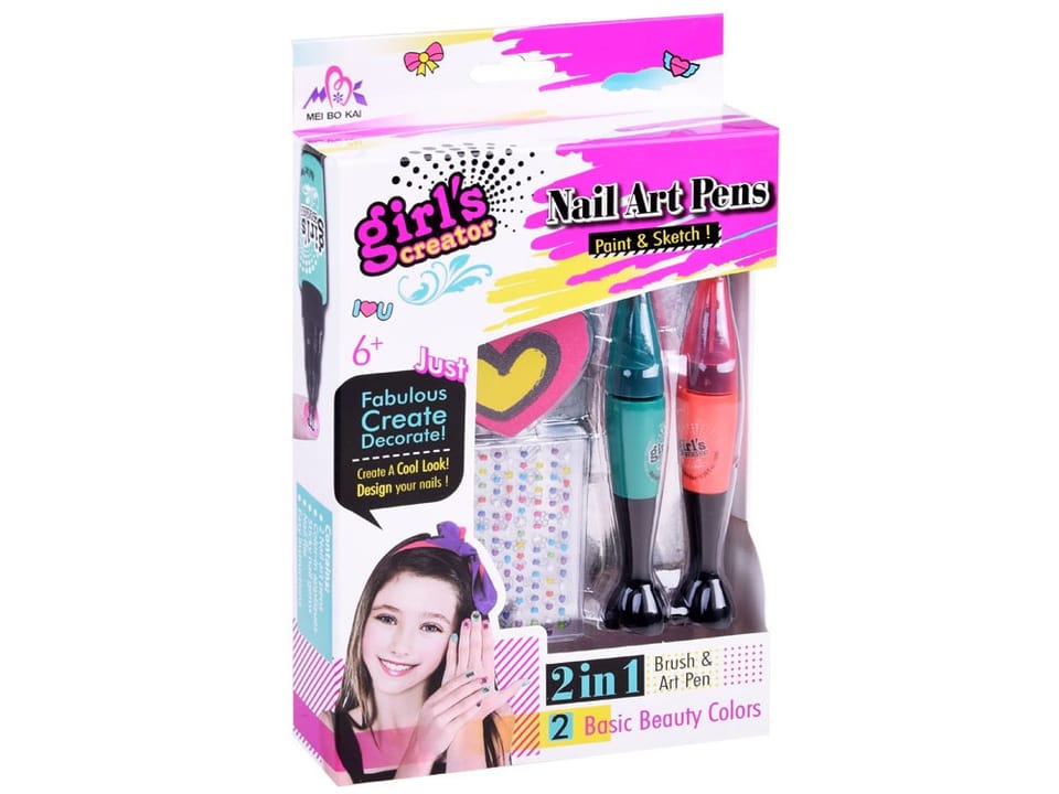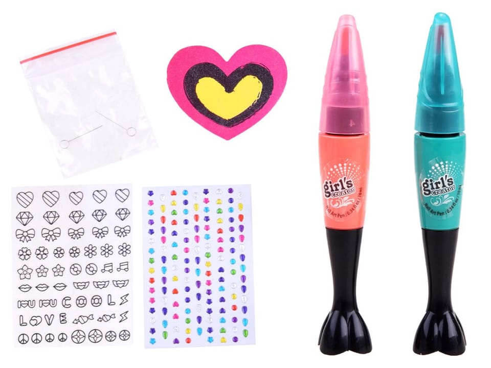 Zestaw do zdobienia paznokci dla dziewczyn. Zestaw składa się z dwóch lakierów z końcówkami do zdobienia, kolorowych naklejek w różnych kształtach, czarnych wzorach do pomalowania i pilniczka w kształcie serca.Lakiery są dostępne w dwóch kolorach dzięki czemu kompozycje mogą być wielobarwne. Wystarczy tylko odrobina wyobraźni, zdolności manualnych i piękne paznokcie gotowe. Zestaw dla małej manikiurzystki sprawdzi się w domowym spa.Dziewczynki lubią podglądać mamy, siostry, ciocie a taki zestaw pozwoli na pierwsze szlify w paznokciowym świecie. Zestaw zawiera:- 2 lakiery- kolorowe naklejki- czarne wzorki- pilniczek- 2 igiełkiZestaw zapakowany w kolorowe opakowanie.