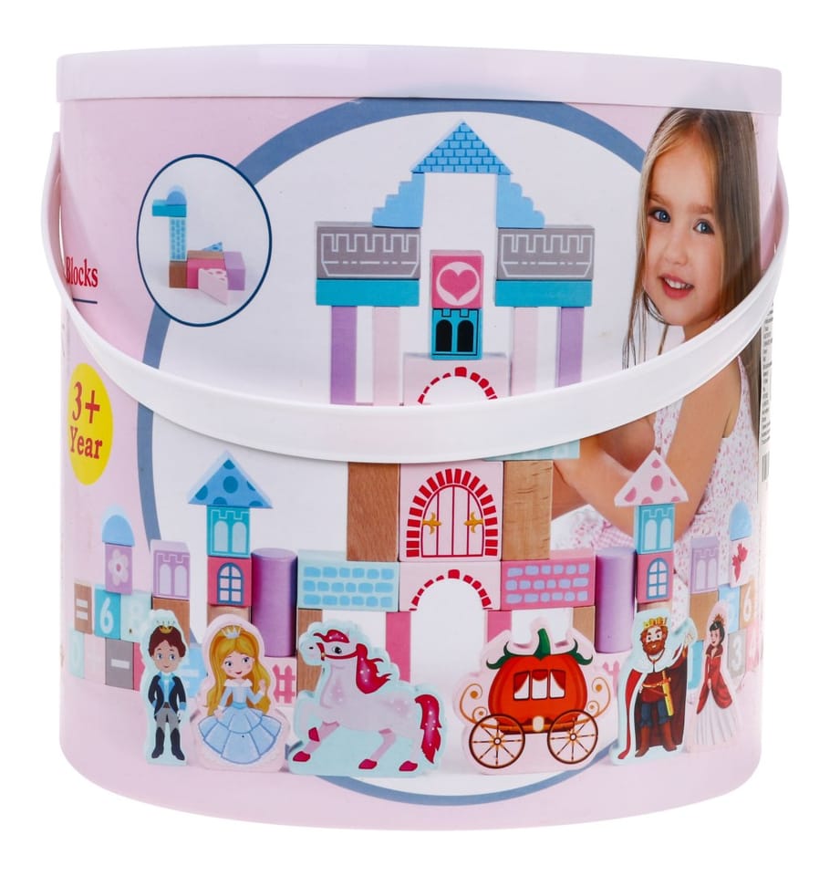 | Zestaw malowanych drewnianych, bezpiecznych klocków z motywem księżniczki i zamku dla dzieci już od 3-go roku życia. Zestaw składa się z 67 elementów- klocków, w zestawie znajdują się też puzzle.Doskonała nauka kształtów, figur geometrycznych, oraz zabawa pobudzająca wyobraźnię i logiczne myślenie.Klocki zapakowane są w wiaderko, sorter na górze którego znajdują się otwory o różnych kształtach, do których należy dopasować odpowiednie klocki. | |